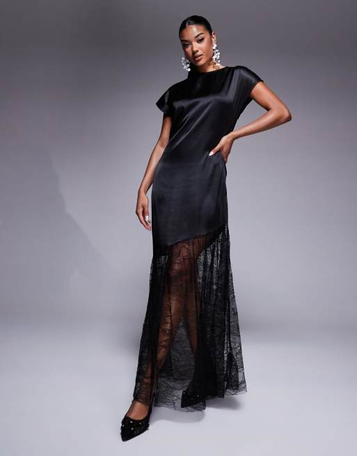 ASOS DESIGN - Robe t-shirt longue en satin et dentelle - Noir