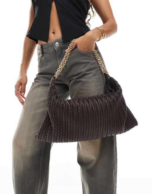 ASOS DESIGN - Sac porté épaule matelassé souple avec bandoulière en chaîne - Chocolat foncé