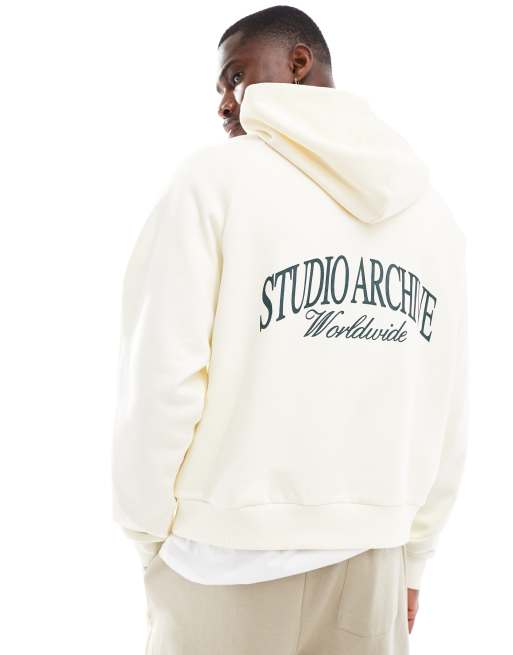 ASOS DESIGN - Sweat à capuche coupe carrée oversize avec fermeture éclair et imprimé Studio Archive - Blanc cassé