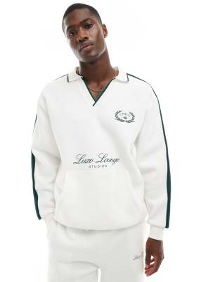 ASOS DESIGN - Sweat oversize à col polo à imprimé et bordures - Beige