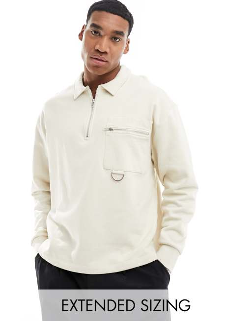 ASOS DESIGN - Sweat oversize à col polo zippé avec anneau en D - Beige
