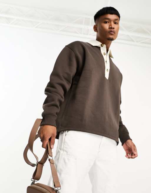 ASOS DESIGN - Sweat oversize style polo avec col boutonné - Marron