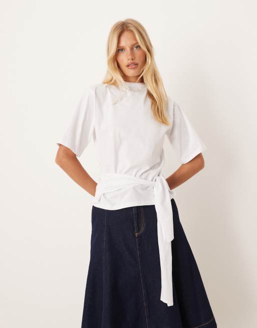 ASOS DESIGN - T-shirt à encolure élargie et liens à la taille - Blanc