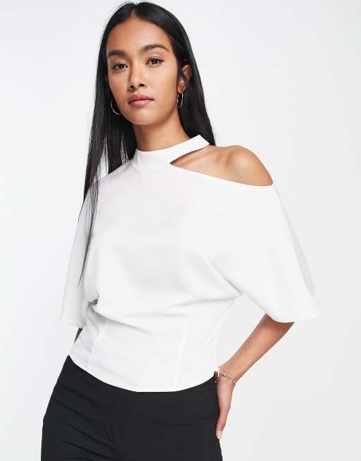 ASOS DESIGN - T-shirt ajusté à découpe et épaule dénudée - Ivoire