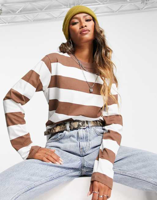 ASOS DESIGN - T-shirt coupe carrée - Blanc et marron rayé