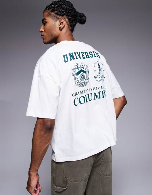 ASOS DESIGN - T-shirt coupe carrée oversize à épaules tombantes et motifs universitaires - Blanc