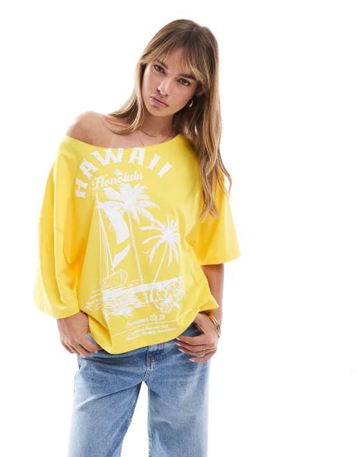 ASOS DESIGN - T-shirt décontracté à épaules dénudées et imprimé Hawaii - Jaune