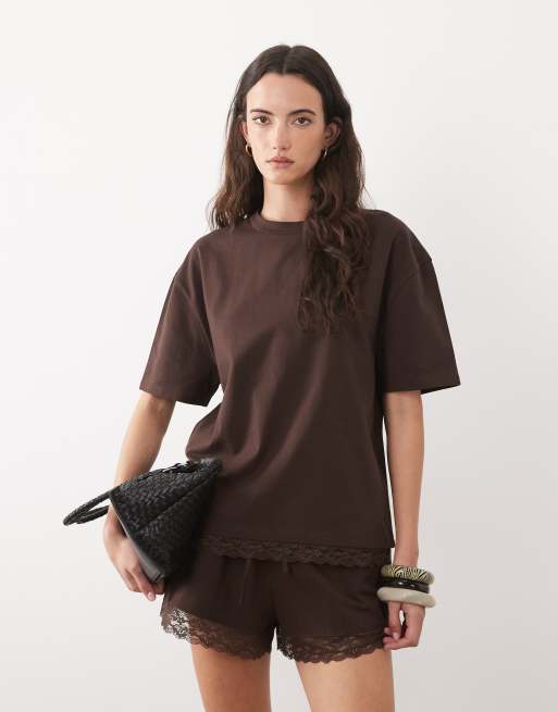 ASOS DESIGN - T-shirt d'ensemble oversize en coton avec ourlet en dentelle - Chocolat