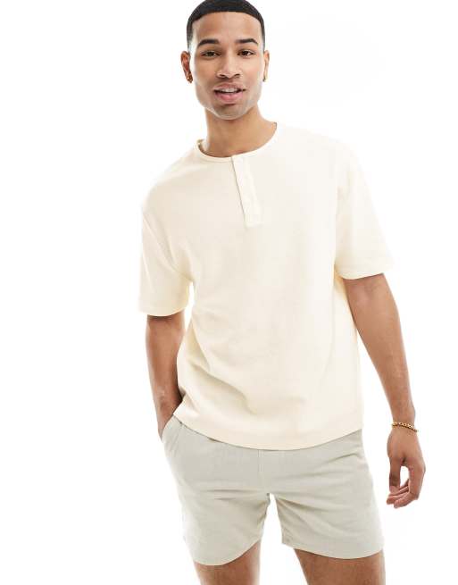 ASOS DESIGN - T-shirt gaufré à col boutonné - Écru