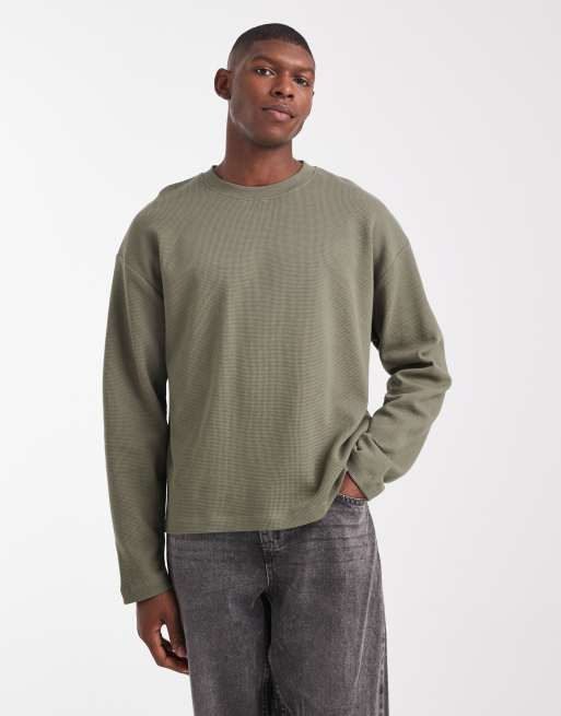 ASOS DESIGN - T-shirt gaufré coupe carrée oversize à manches longues - Kaki