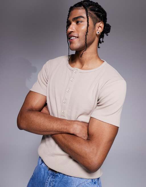 ASOS DESIGN - T-shirt moulant côtelé à col boutonné - Beige