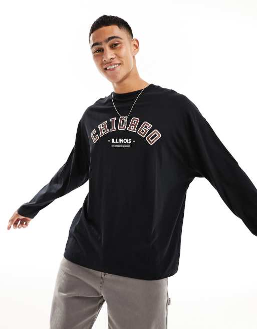 ASOS DESIGN - T-shirt oversize à manches longues avec imprimé Chicago sur le devant - Noir