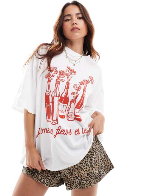 ASOS DESIGN - T-shirt oversize avec imprimé fleurs et bouteilles de vin - Blanc