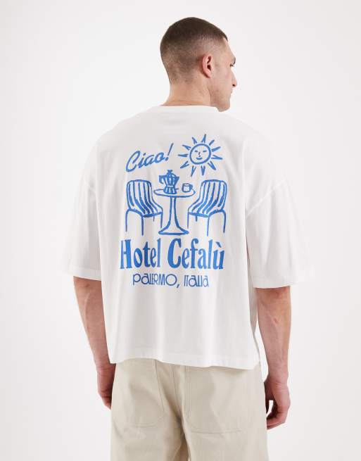ASOS DESIGN - T-shirt oversize coupe carrée avec imprimé hôtel - Blanc.