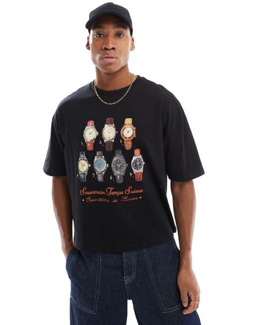 ASOS DESIGN - T-shirt oversize coupe carrée avec imprimé montres sur le devant - Noir