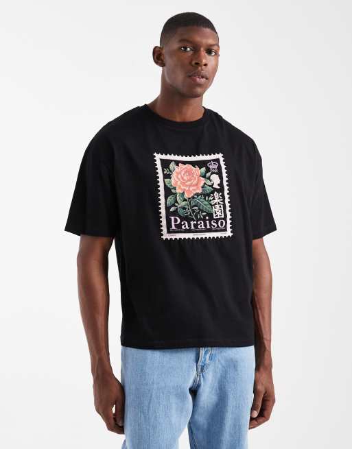 ASOS DESIGN - T-shirt oversize coupe carrée avec imprimé timbre à motif fleuri - Noir