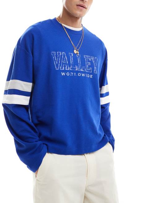 ASOS DESIGN - T-shirt oversize coupe carrée en tissu épais avec manches longues et imprimé Valley sur la poitrine - Bleu