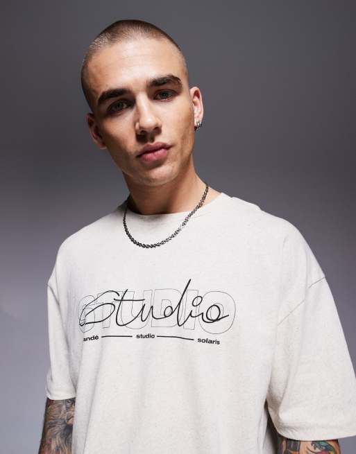 ASOS DESIGN - T-shirt oversize en lin mélangé à imprimé texte - Crème