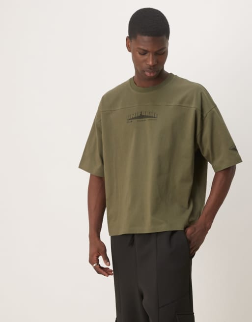 ASOS DESIGN - T-shirt oversize épais coupe carrée avec surpiqûres et imprimé sur la poitrine - Kaki