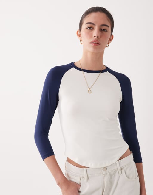 ASOS DESIGN - T-shirt style baseball en polyamide à manches trois-quarts - Bleu marine