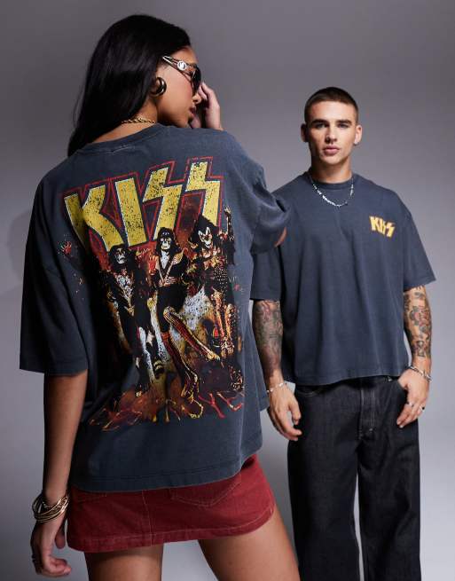 ASOS DESIGN - T-shirt unisexe coupe carrée oversize avec imprimés Kiss - Noir délavé