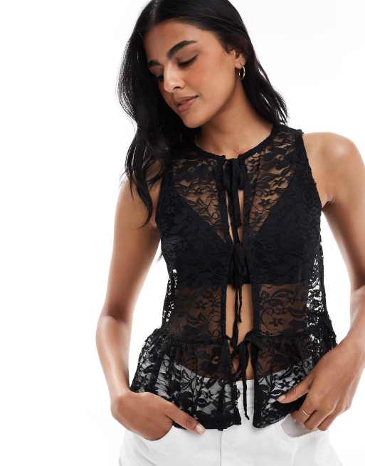 ASOS DESIGN - Top à basque en dentelle noué sur l'avant - Noir