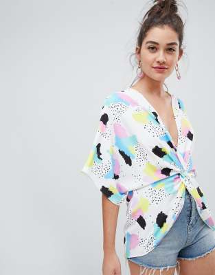 ASOS DESIGN - Top à manches kimono avec nœud sur le devant et imprimé graphique
