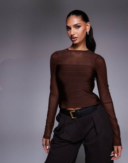 ASOS DESIGN - Top à manches longues en tulle avec empiècements style bandage - Chocolat