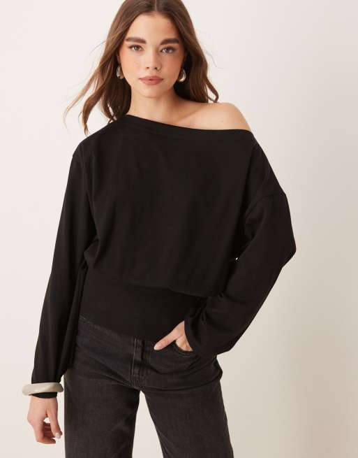 ASOS DESIGN - Top ample à manches longues et épaule dénudée - Noir