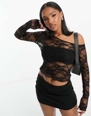 ASOS DESIGN - Top asymétrique en dentelle transparente - Noir