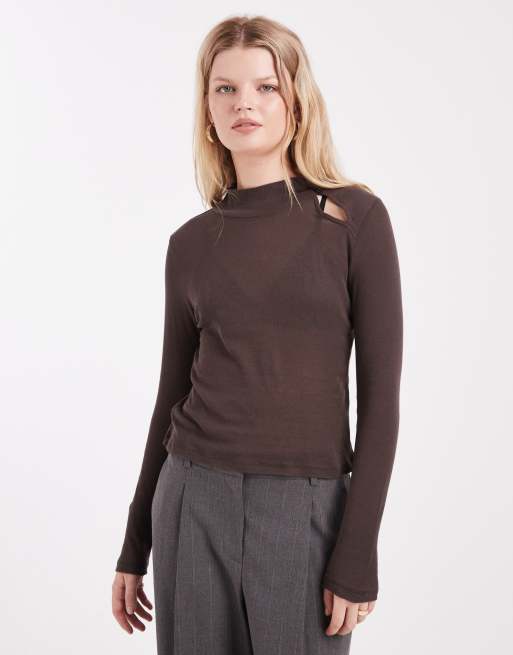 ASOS DESIGN - Top boutonné à manches longues et col cheminée - Marron chocolat