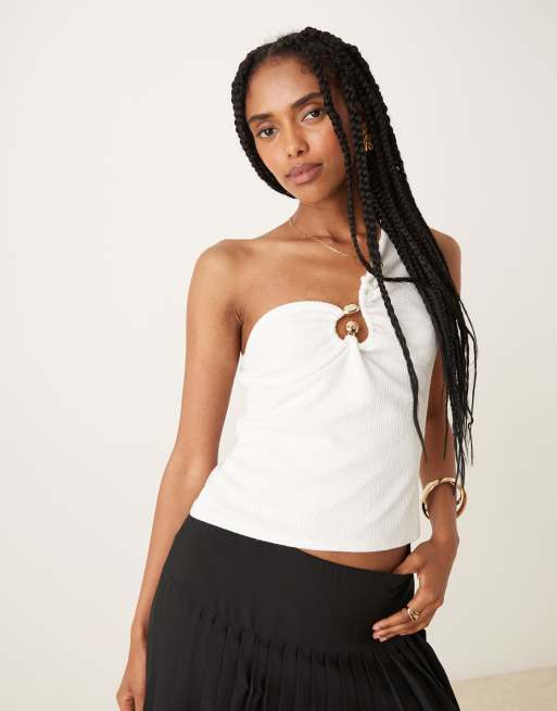 ASOS DESIGN - Top côtelé asymétrique avec détail métallique doré - Crème