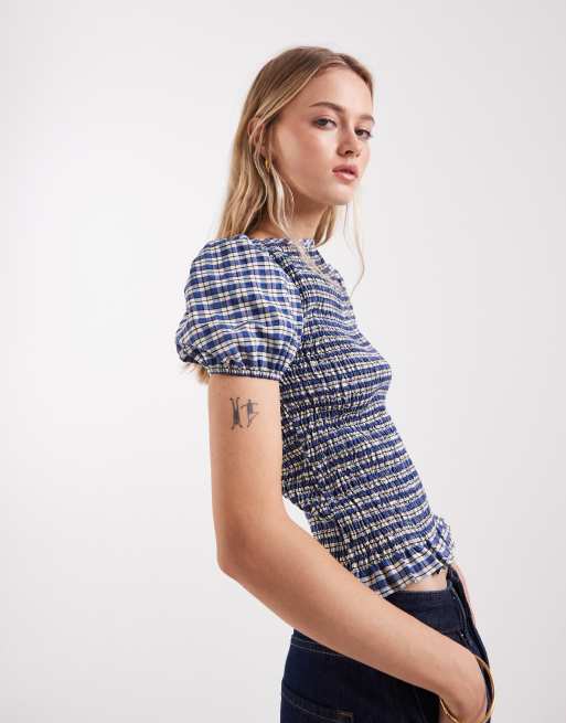 ASOS DESIGN - Top d'ensemble froncé à carreaux avec manches bouffantes - Bleu
