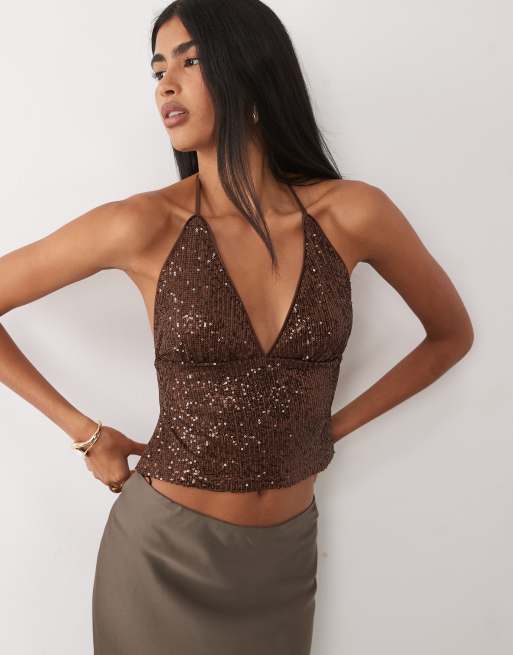 ASOS DESIGN - Top dos nu orné de sequins avec liens noués autour du cou - Chocolat