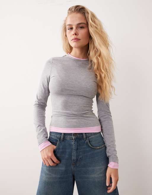 ASOS DESIGN - Top double épaisseur à manches longues - Gris chiné et rose clair