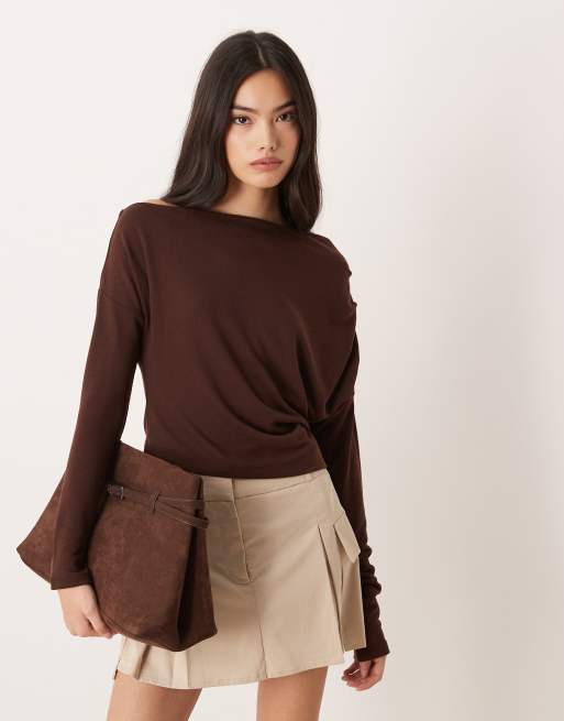 ASOS DESIGN - Top en aspect maille avec manches longues et épaule tombante - Marron