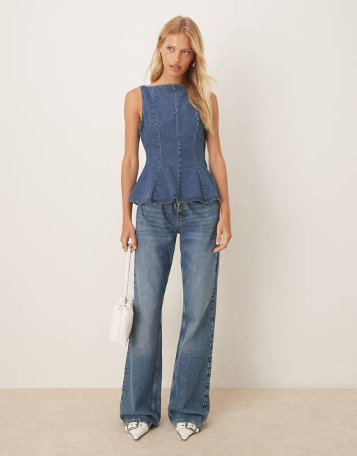 ASOS DESIGN - Top en denim avec ourlet à basque - Bleu moyen