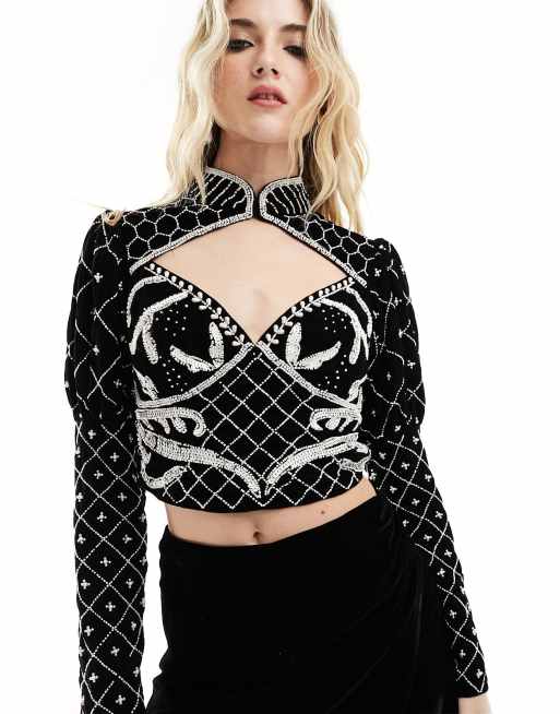 ASOS DESIGN - Top en velours orné de perles avec découpes - Noir