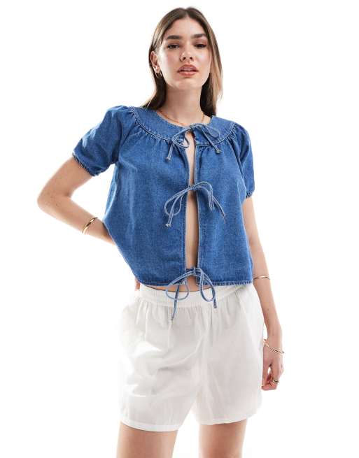 ASOS DESIGN - Top évasé en denim avec col - Bleu moyen