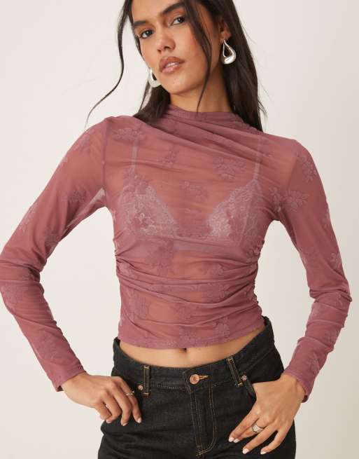 ASOS DESIGN - Top floqué manches longues à col montant et fronces - Rose