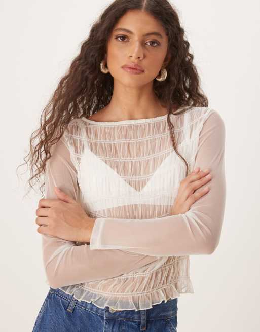 ASOS DESIGN - Top froncé en tulle à manches longues - Crème