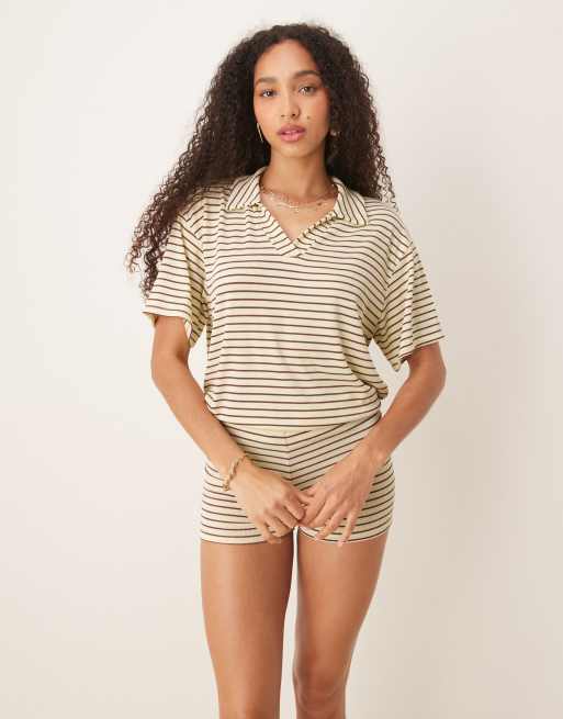 ASOS DESIGN - Top manches courtes rayé d'ensemble avec col style rugby - Jaune et chocolat rayé