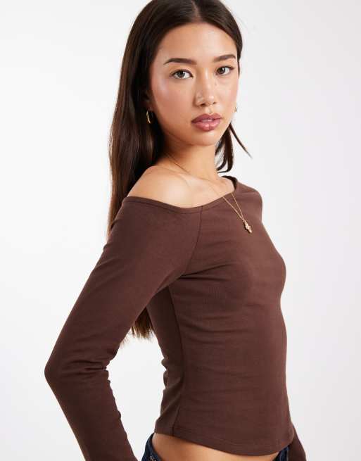 ASOS DESIGN - Top manches longues en coton à épaules dénudées - Chocolat