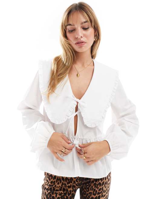 ASOS DESIGN - Top manches longues en coton avec col oversize à volants - Blanc
