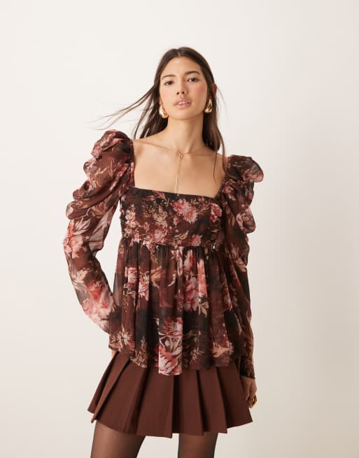 ASOS DESIGN - Top manches longues en mousseline fluide à fleurs avec encolure carrée