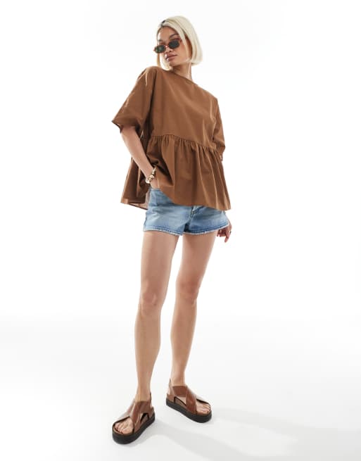 ASOS DESIGN - Top oversize smocké à basque et manches courtes en lin mélangé - Marron