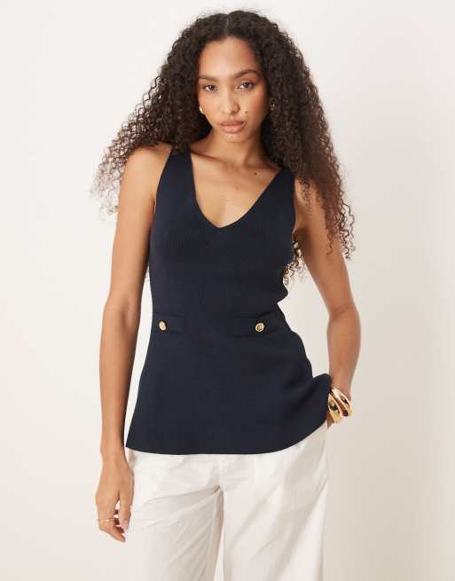 ASOS DESIGN - Top structuré en maille avec revers et ourlet à basque - Bleu marine