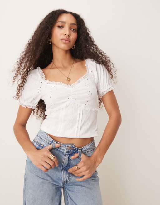 ASOS DESIGN - Top tendance folk en broderie anglaise à manches bouffantes et bordure en dentelle - Blanc