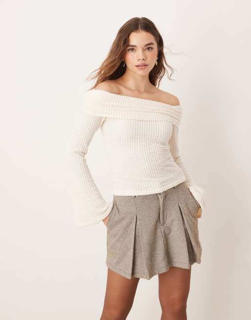 ASOS DESIGN - Top texturé ultra doux à encolure Bardot et manches évasées - Crème