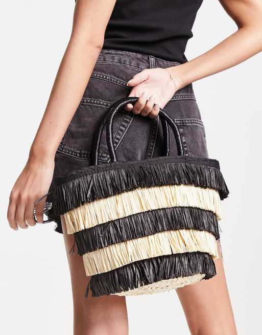 ASOS DESIGN - Tote bag en paille à franges - Noir et naturel